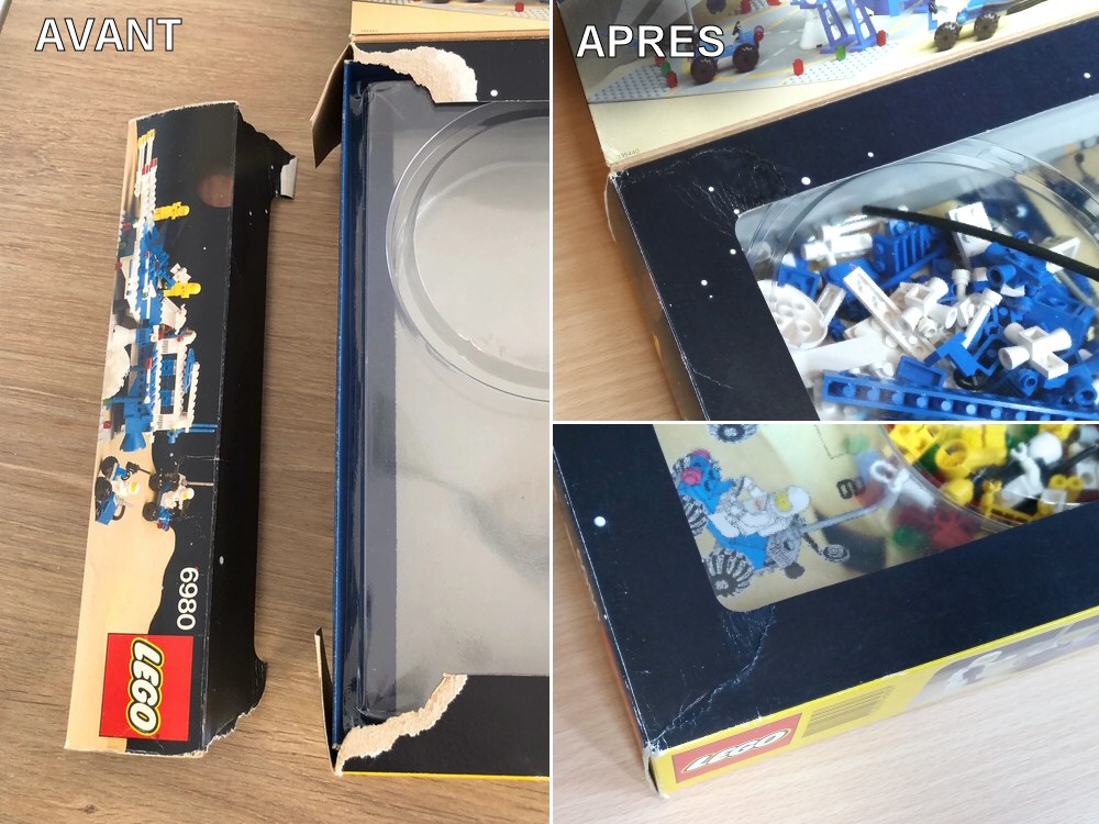 J'ai d'abord recollé à la colle Uhu classique (on néglige trop cette colle basique alors que pour du papier/carton, c'est aussi efficace que de la glu et ça laisse le temps de bien ajuster), puis rajout de languettes carton de 7-8cm de long "sous" les 2 déchirures, et enfin un léger coup de peinture de la couleur qui va bien (mélange maison), et hop...