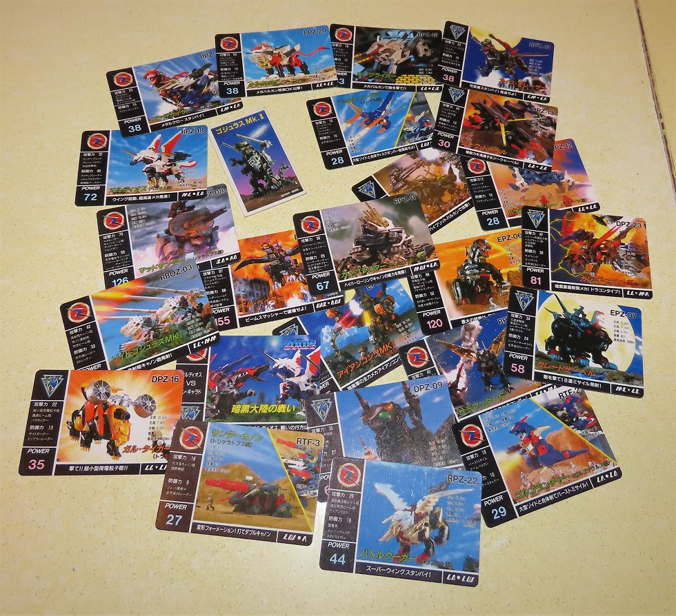 Encore du produit dérivé Zoids, à savoir... des cartes à la con (comme les cartes Pokemon, mais Zoids). J'en avais déjà, mais des NJR. Là, ce sont des OJR. Alors dans l'absolu, jamais je n'aurais acheté ça. Surtout que chaque fois qu'un bout de papier Zoids passe aux enchères en provenance du Japon, les prix sont à deux ou trois chiffres. Mais là, sur un site de vente trouvé par hasard, en Espagne, je tombe sur un vendeur qui les fait à... 1 euro pièce. Bon ben j'ai pris le lot, c'est rigolo.