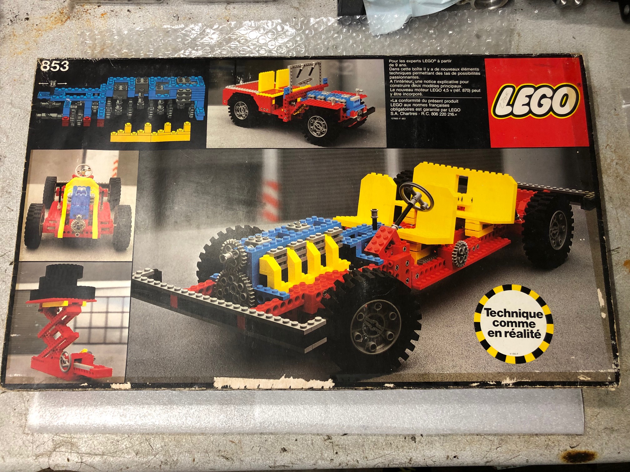 Le chassis 853 est arrivé !! le vendeur m'a dit qu'il avait que la notice mais en fait il y avait 2 dépliants pubs dans le doublage du couvercle où se range la notice