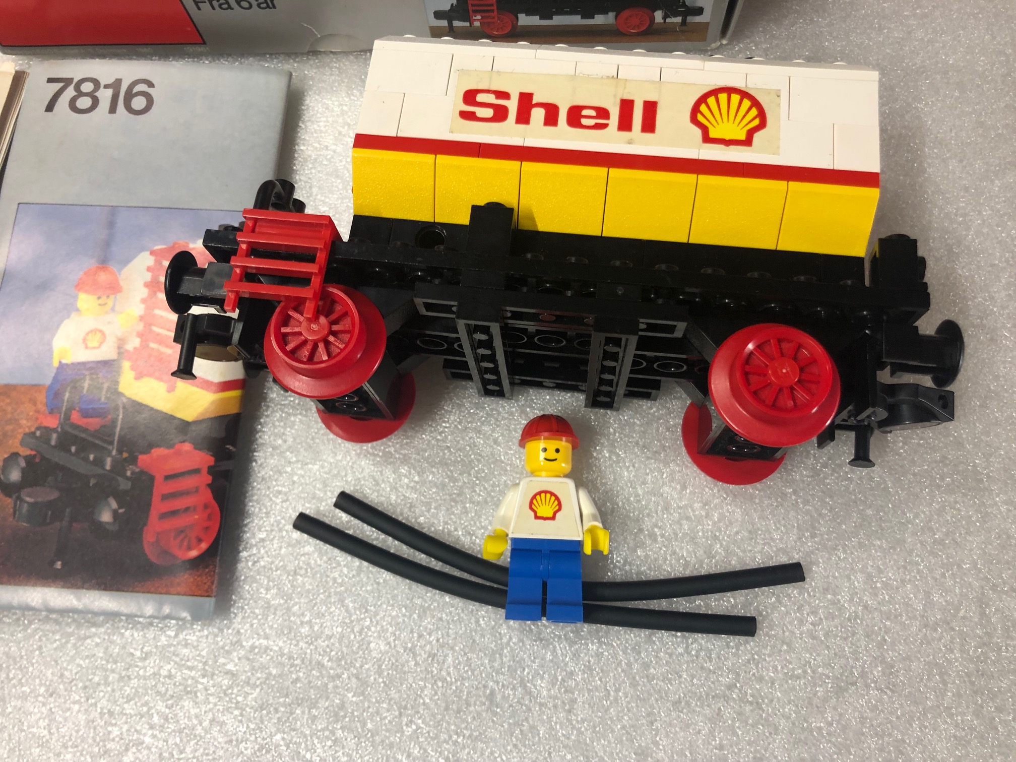 J'ai remonté la loco et le wagon Shell pour le fun car ils tiennent dans leur boite ! hi hi (C'est plaisant de monter du Lego! Ca faisant longtemps car j'ai plus souvent pour habitude des les démonter pour les ranger dans leur boite: je vais surement remonter les 2 autres wagon aussi! )