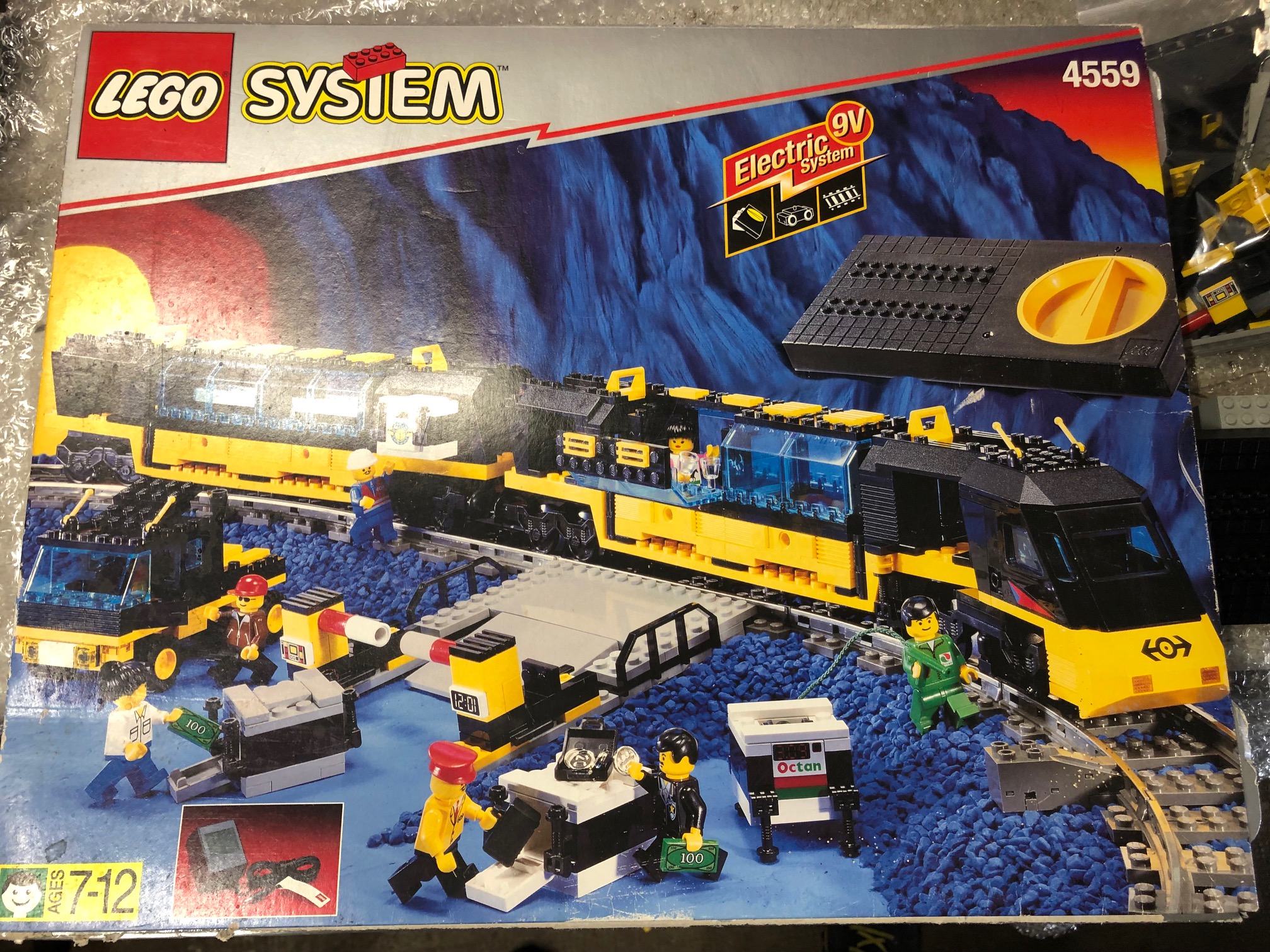 Sinon j'ai craqué sur un set Train qui est passé sur Ebay. le 4559 sortie en 96. Pas des années qui m’intéressent mais il est complet en bon état peu servis avec ses dépliants. Une boite bien propre qui a son cache supérieure (qui est une partie qui se décollait via la flèche: un peu comme les boites Lego de fin 70/début 80 qui avait un film plastique collé sur le polystyrènes des boites) Il manque l'insert comme d'hab ! pas donné qd même car 80 € (Mais bien loin des tarifs pratiqués pour son grand frère le 4558!)