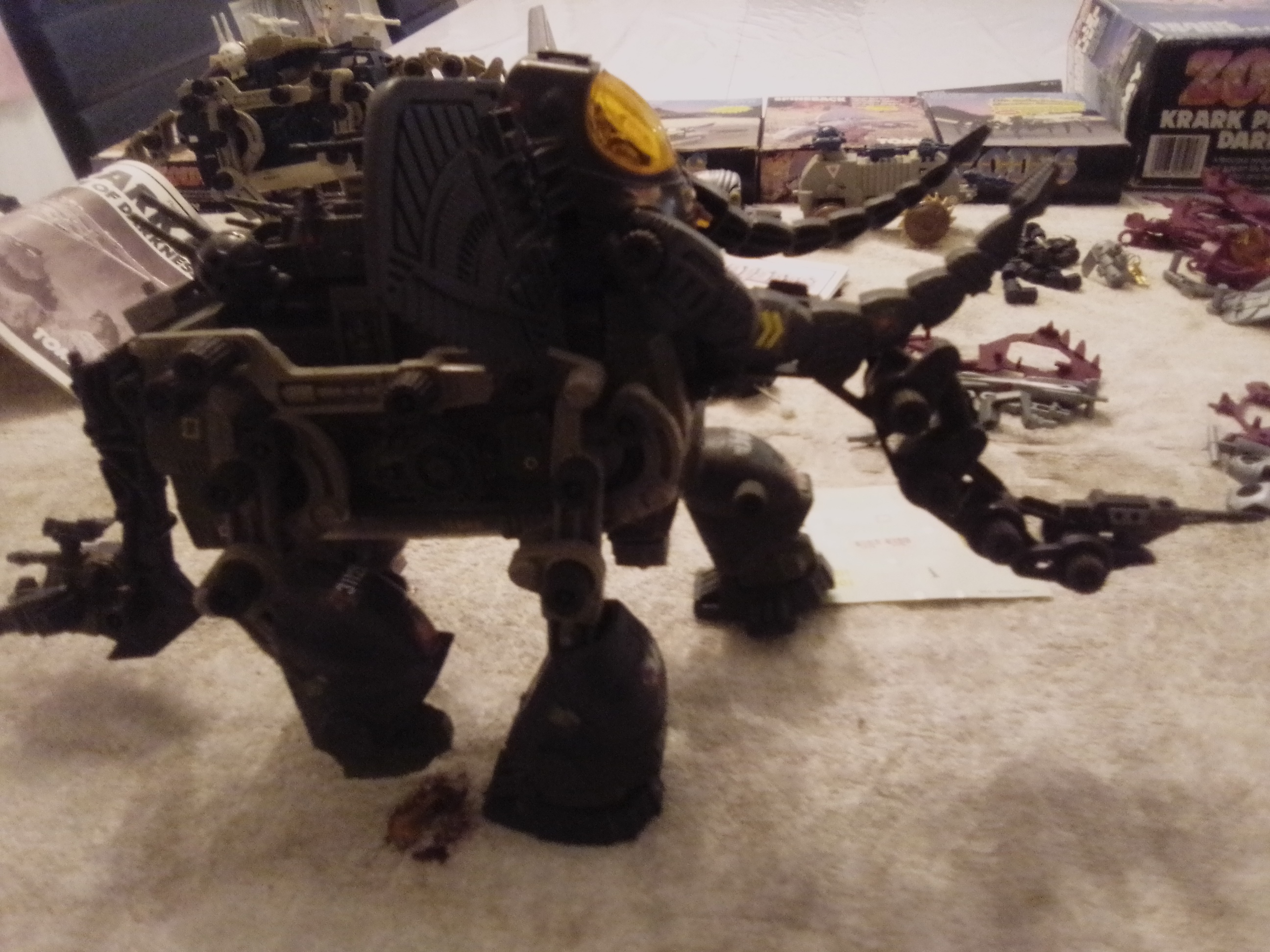 Hello mon dernier arrivage un mammouth bleu ou vert bien poussiéreux je l'avais pas il manque qu'un canon et un cassé ..avec un zrk bien jauni un sliter avec sa petite roulette retrouvé au fond du colis oufff.. un krark qui a l'air complet quelle pièces et des boîtes ..vides. Au début de ma collection je m'en fouté des boîtes mais bon maintenant je l'ai veux toutes ..lol
