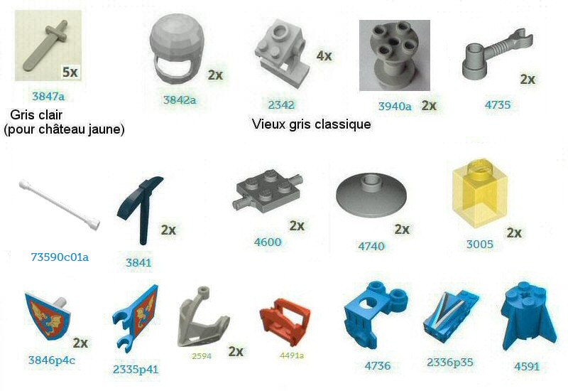 J'ai surtout rajouté les minifigs qui me manquent, et 2-3 pièces, notamment les haches et épées en gris clair pour le château jaune...