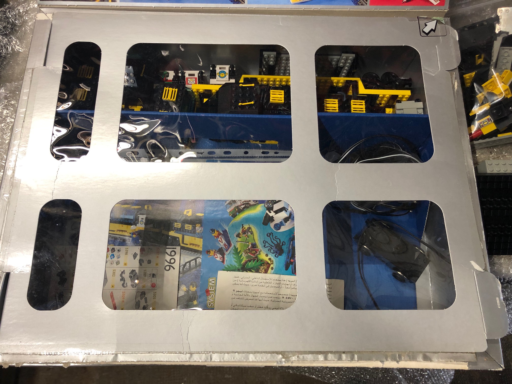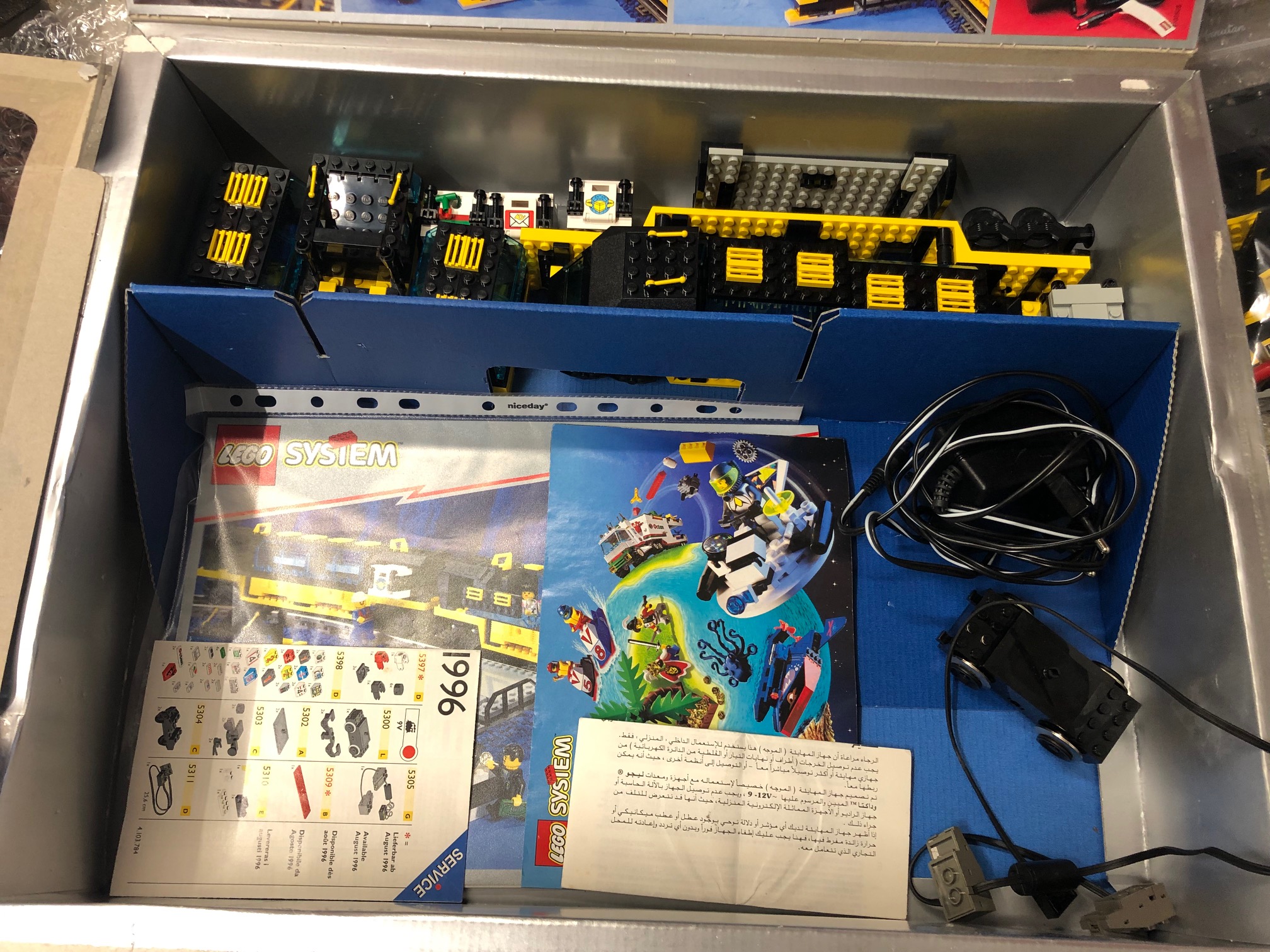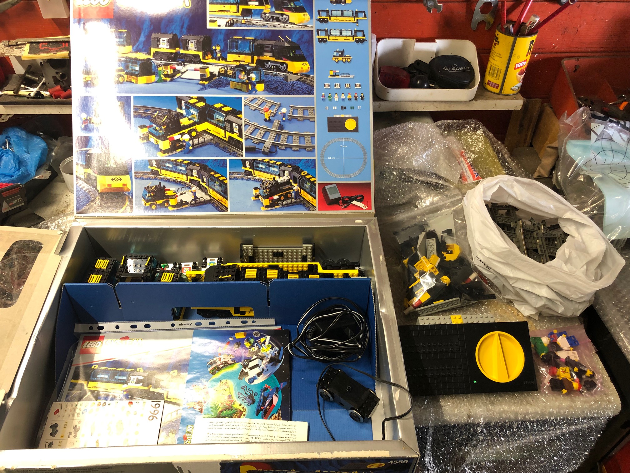 Sinon j'ai craqué sur un set Train qui est passé sur Ebay. le 4559 sortie en 96. Pas des années qui m’intéressent mais il est complet en bon état peu servis avec ses dépliants. Une boite bien propre qui a son cache supérieure (qui est une partie qui se décollait via la flèche: un peu comme les boites Lego de fin 70/début 80 qui avait un film plastique collé sur le polystyrènes des boites) Il manque l'insert comme d'hab ! pas donné qd même car 80 € (Mais bien loin des tarifs pratiqués pour son grand frère le 4558!)